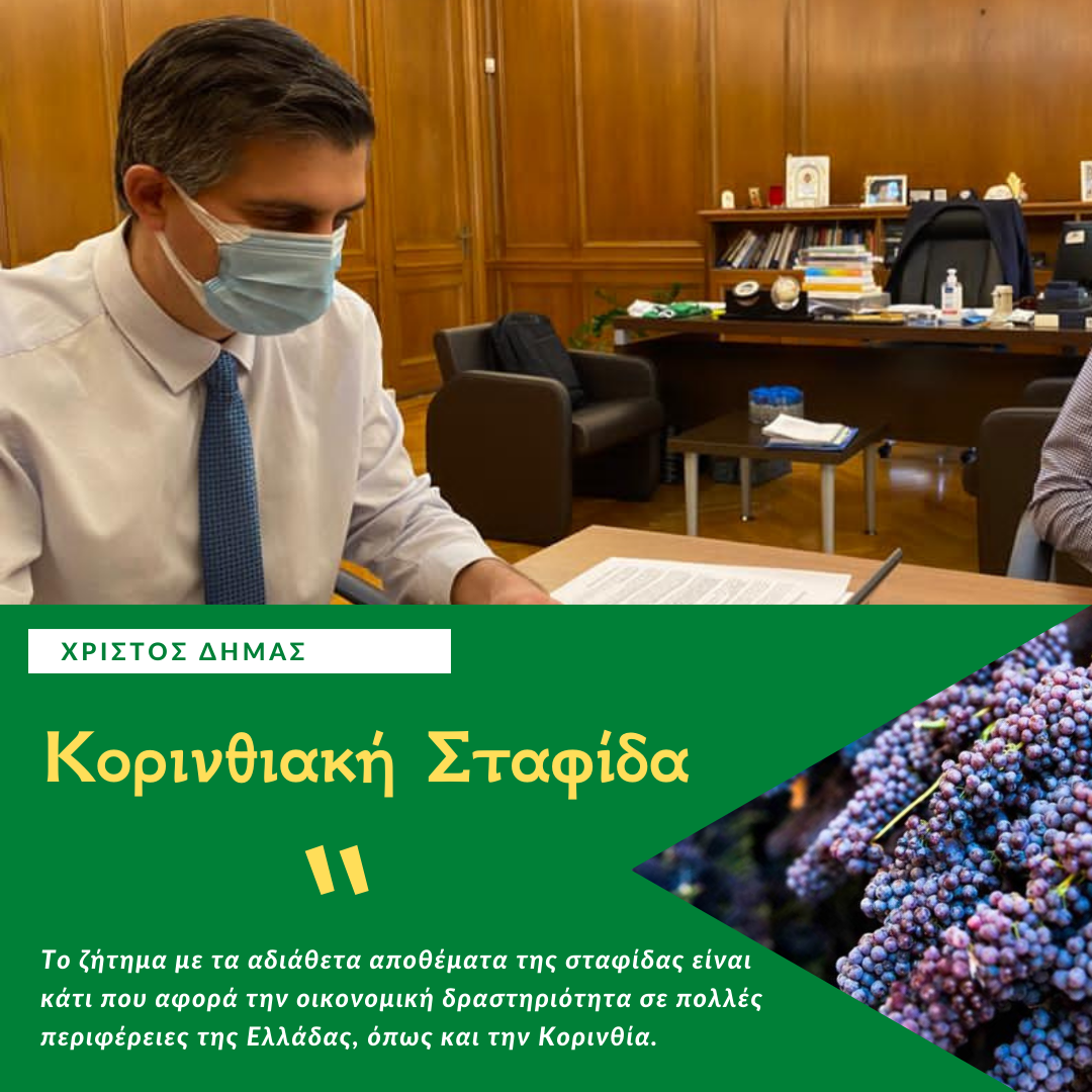 Τηλεδιάσκεψη Χρ. Δήμα με τον Υπουργό Αγροτικής Ανάπτυξης Σπήλιο Λιβανό για την κορινθιακή σταφίδα. Ο Υφυπουργός Ανάπτυξης και Επενδύσεων και Βουλευτής Χρίστος Δήμας συμμετείχε σε τηλεδιάσκεψη με θέμα την Κορινθιακή σταφίδα. Στην τηλεδιάσκεψη συμμετείχαν ο Υπουργός Αγροτικής Ανάπτυξης κ. Σπήλιος Λιβανός, τα Επιμελητήρια Κορινθίας, Αχαΐας, Ηλείας και Μεσσηνίας, εκπρόσωποι ιδιωτικών και συνεταιριστικών συσκευαστηρίων, καθώς και εξαγωγείς σταφίδας.